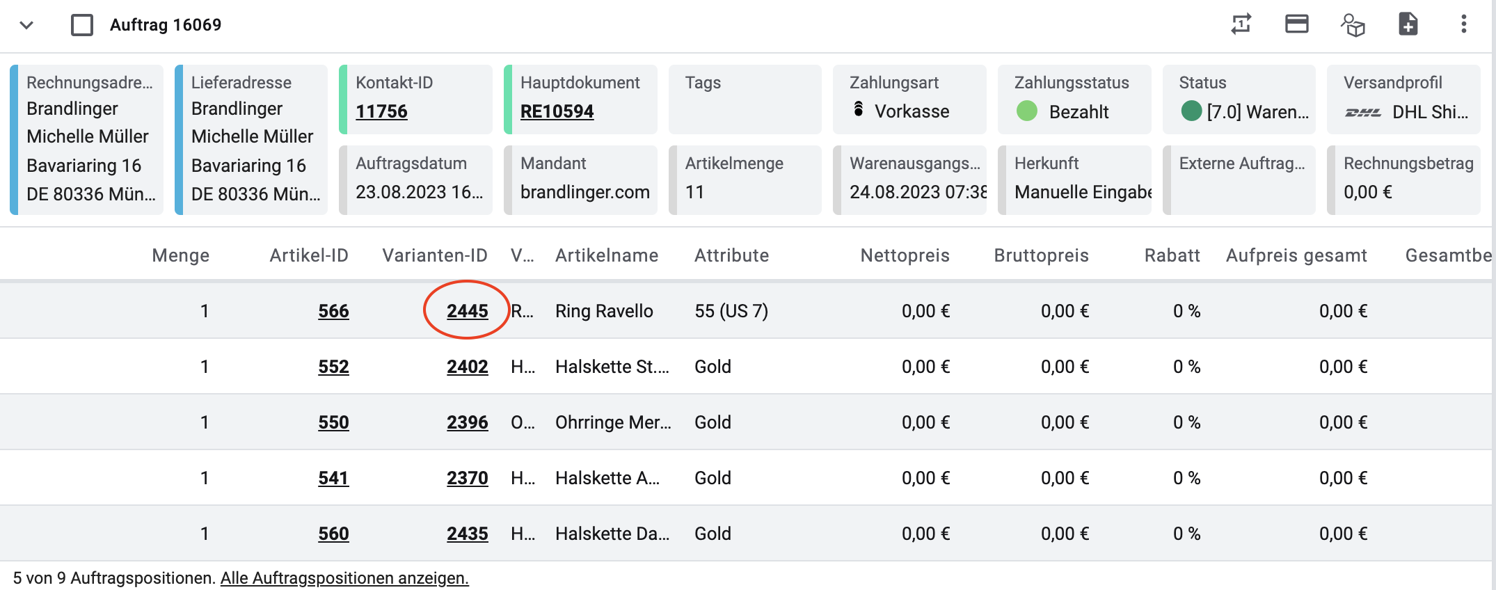 plenty > Aufträge > Bestellung über Kundenname suchen > Produkt über die Varianten ID auswählen