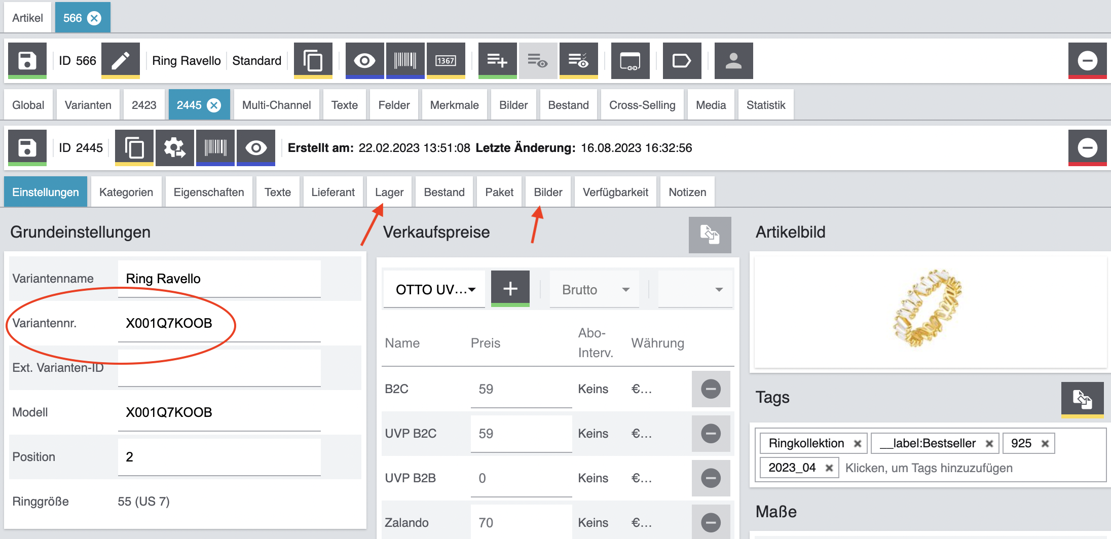 - > Variantennummer kopieren, Lagerort und Bild: