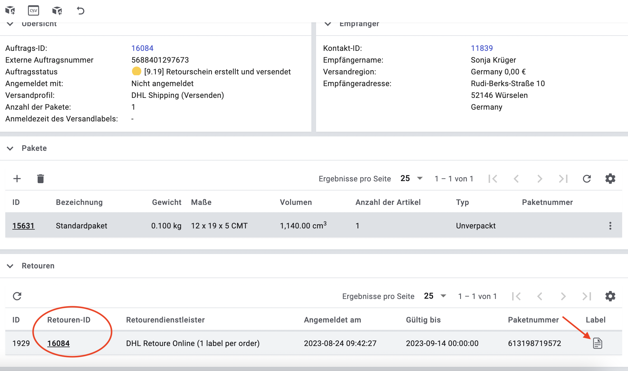 - Retourenetikett erstellen & an Kunde in obiger Mail mitsenden: